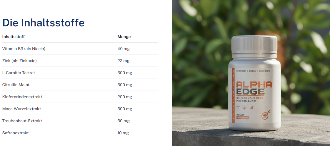 Alpha Edge Kapseln werden aus natürlichen Kräuterbestandteilen hergestellt, die die Gesundheit, Energie und Ausdauer von Männern unterstützen. Diese Zutaten werden ausgewählt, um dem Körper auf natürliche Weise besser zu funktionieren.