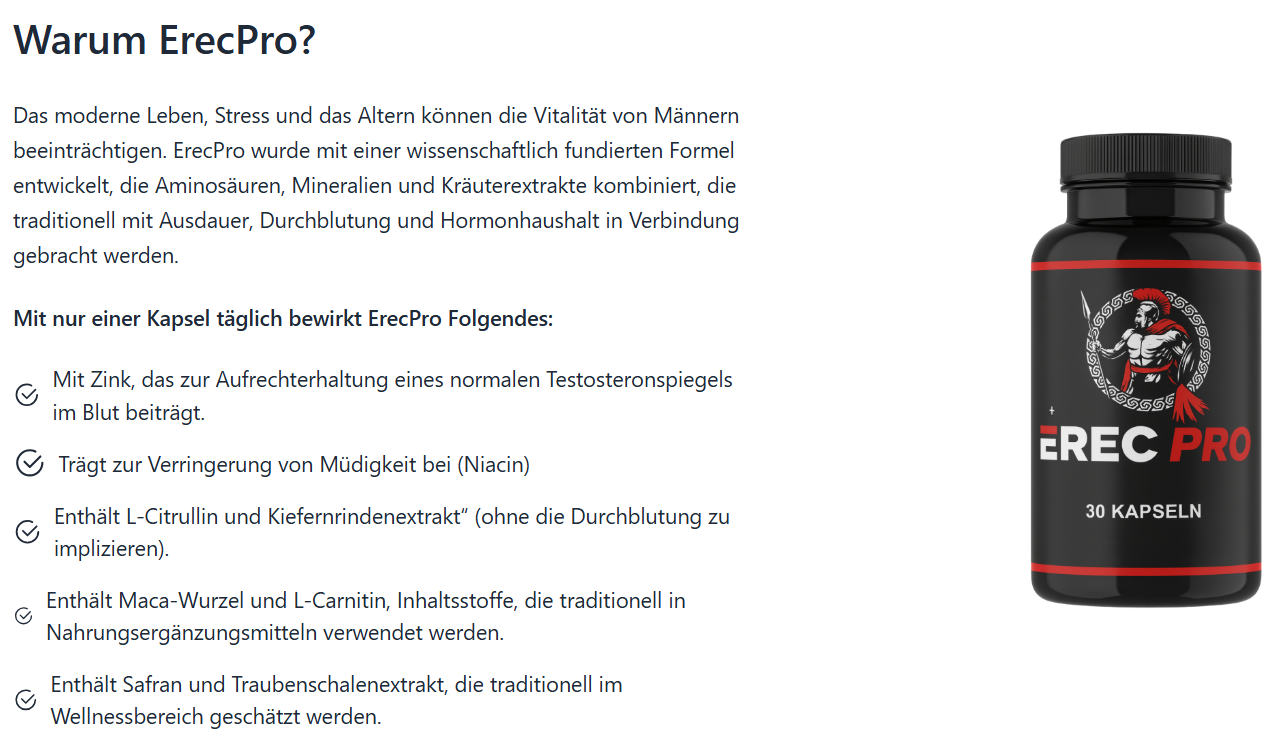 Der Hersteller behauptet, dass ErecPro hilft, Müdigkeit zu reduzieren, das hormonelle Gleichgewicht unterstützt und die Ausdauer verbessert. Es beruht nicht auf Chemikalien oder künstlichen Stimulanzien. Stattdessen werden bewährte natürliche Inhaltsstoffe wie Zink, L-Citrullin, Maca und Safran verwendet, die seit langem mit einer verbesserten männlichen Vitalität in Verbindung gebracht werden.